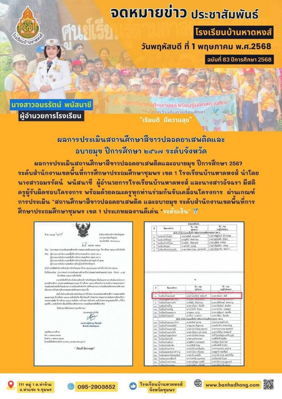 ผลการประเมินสถานศึกษาสีขาวปลอดยาเสพติดและอบายมุข ปีการศึกษา 2567 ระดับสำนักงานเขตพื้นที่การศึกษาประถมศึกษาชุมพร เขต 1 โรงเรียนบ้านหาดหงส์ นำโดย นางสาวอมรรัตน์ พนัสนาชี ผู้อำนวยการโรงเรียนบ้านหาดหงส์ และนางสาวอัจฉรา มีสติ ครูผู้รับผิดชอบโครงการ พร้อมด้วยคณะครูทุกท่านร่วมกันขับเคลื่อนโครงการ ผ่านเกณฑ์การประเมิน "สถานศึกษาสีขาวปลอดยาเสพติด และอบายมุข ระดับสำนักงานเขตพื้นที่การศึกษาประถมศึกษาชุมพร เขต 1 ประเภทผลงานดีเด่น "ระดับเงิน"
