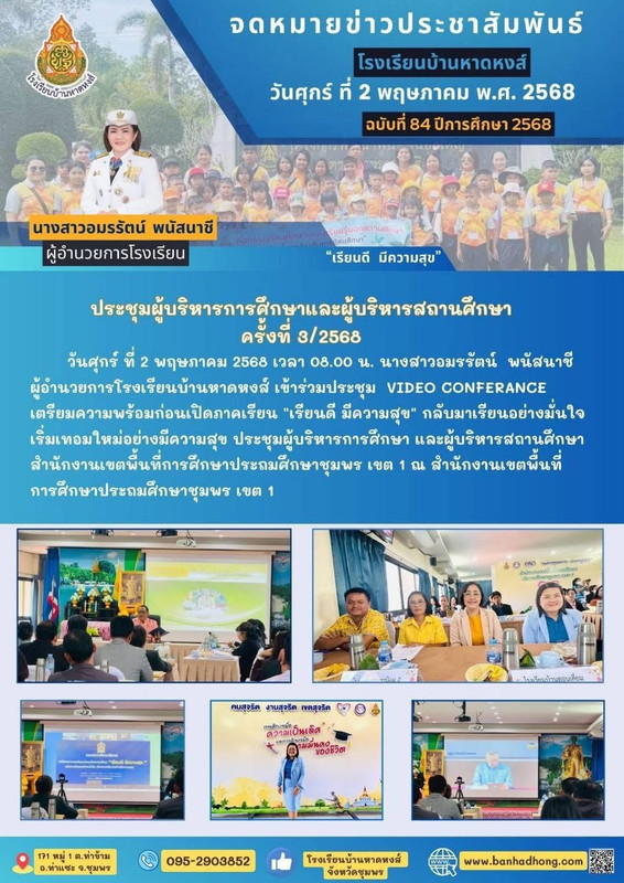 นางสาวอมรรัตน์ พนัสนาชี ผู้อำนวยการโรงเรียนบ้านหาดหงส์ เข้าร่วมประชุม Video Conferance เตรียมความพร้อมก่อนเปิดภาคเรียน "เรียนดี มีความสุข" กลับมาเรียนอย่างมั่นใจ เริ่มเทอมใหม่อย่างมีความสุข ประชุมผู้บริหารการศึกษา และผู้บริหารสถานศึกษา สำนักงานเขตพื้นที่การศึกษาประถมศึกษาชุมพร เขต 1 ณ สำนักงานเขตพื้นที่การศึกษาประถมศึกษาชุมพร เขต 1
