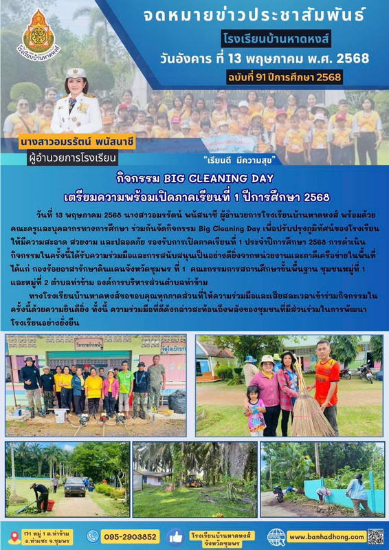 วันที่ 13 พฤษภาคม 2568 นางสาวอมรรัตน์ พนัสนาชี ผู้อำนวยการโรงเรียนบ้านหาดหงส์ พร้อมด้วยคณะครูและบุคลากรทางการศึกษา ร่วมกันจัดห้มีความสะอาด สวยงาม และปลอดภัย รองรับการเปิดภาคเรียนที่ 1 ประจำปีการศึกษา 2568 การดำเนินกิจกรรมในครั้งนี้ได้รับความร่วมมือและการสนับสนุนเป็นอย่างดียิ่งจากหน่วยงานและภาคีเครือข่ายในพื้นที่ ได้แก่ กองร้อยอาสารักษาดินแดนจังหวัดชุมพร ที่ 1 คณะกรรมการสถานศึกษาขั้นพื้นฐาน ชุมชนหมู่ที่ 1 และหมู่ที่ 2 ตำบลท่าข้าม องค์การบริหารส่วนตำบลท่าข้าม