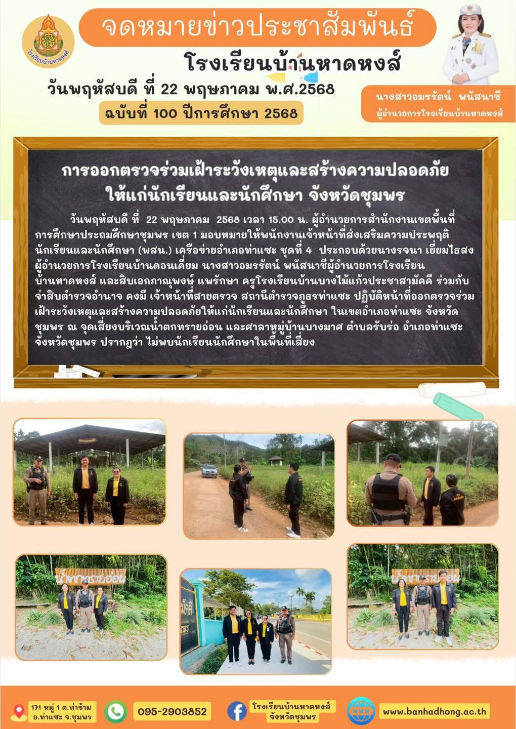 วันพฤหัสบดี ที่ 22 พฤษภาคม 2568 เวลา 15.00 น. ผู้อำนวยการสำนักงานเขตพื้นที่การศึกษาประถมศึกษาชุมพร เขต 1 มอบหมายให้พนักงานเจ้าหน้าที่ส่งเสริมความประพฤตินักเรียนและนักศึกษา (พสน.) เครือข่ายอำเภอท่าแซะ ชุดที่ 4 ประกอบด้วยนางรจนา เยี่ยมไธสง ผู้อำนวยการโรงเรียนบ้านดอนเคี่ยม นางสาวอมรรัตน์ พนัสนาชีผู้อำนวยการโรงเรียนบ้านหาดหงส์ และสิบเอกภาณุพงษ์ แพรักษา ครูโรงเรียนบ้านบางไม้แก้วประชาสามัคคี ร่วมกับจ่าสิบตำรวจอำนาจ คงมี เจ้าหน้าที่สายตรวจ สถานีตำรวจภูธรท่าแซะ ปฏิบัติหน้าที่ออกตรวจร่วมเฝ้าระวังเหตุและสร้างความปลอดภัยให้แก่นักเรียนและนักศึกษา ในเขตอำเภอท่าแซะ จังหวัดชุมพร ณ จุดเสี่ยงบริเวณน้ำตกทรายอ่อน และศาลาหมู่บ้านบางมาศ ตำบลรับร่อ อำเภอท่าแซะ จังหวัดชุมพร ปรากฎว่า ไม่พบนักเรียนนักศึกษาในพื้นที่เสี่ยง