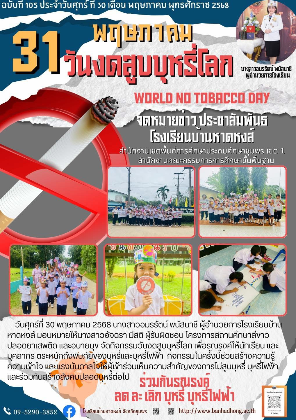 วันศุกร์ที่ 30 พฤษภาคม 2568 นางสาวอมรรัตน์ พนัสนาชี ผู้อำนวยการโรงเรียนบ้านหาดหงส์ มอบหมายให้นางสาวอัจฉรา มีสติ ผู้รับผิดชอบ โครงการสถานศึกษาสีขาว ปลอดยาเสพติด และอบายมุข จัดกิจกรรมวันงดสูบบุหรี่โลก เพื่อรณรงค์ให้นักเรียน และบุคลากร ตระหนักถึงพิษภัยของบุหรี่และบุหรี่ไฟฟ้า กิจกรรมในครั้งนี้ช่วยสร้างความรู้ ความเข้าใจ และแรงบันดาลใจให้ผู้เข้าร่วมเห็นความสำคัญของการไม่สูบบุหรี่ บุหรี่ไฟฟ้า และร่วมกันสร้างสังคมปลอดบุหรี่ต่อไป