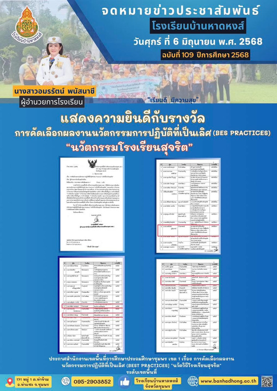 สำนักงานเขตพื้นที่การศึกษาประถมศึกษาชุมพร เขต 1 ได้ดำเนินการคัดเลือกผลงานนวัตกรรมการปฎิบัติที่เป็นเลิศ (Best Practices) "นวัตวิถีโรงเรียนสุจริต" โรงเรียนบ้านหาดหงส์ ขอแสดงความยินดีกับคณะครูทุกท่าน