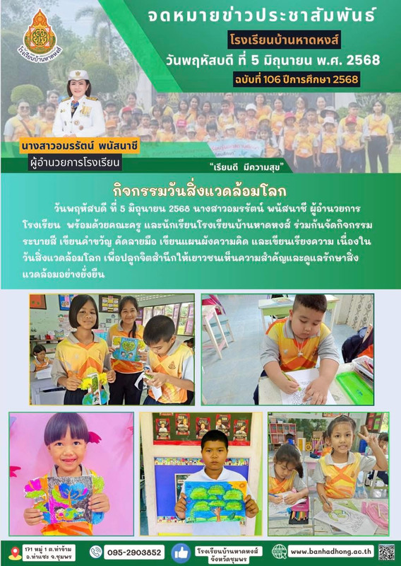 วันพฤหัสบดี ที่ 5 มิถุนายน 2568 นางสาวอมรรัตน์ พนัสนาชี ผู้อำนวยการโรงเรียน พร้อมด้วยคณะครู และนักเรียนโรงเรียนบ้านหาดหงส์ ร่วมกันจัดกิจกรรมระบายสี เขียนคำขวัญ คัดลายมือ เขียนแผนผังความคิด และเขียนเรียงความ เนื่องในวันสิ่งแวดล้อมโลก เพื่อปลูกจิตสำนึกให้เยาวชนเห็นความสำคัญและดูแลรักษาสิ่งแวดล้อมอย่างยั่งยืน