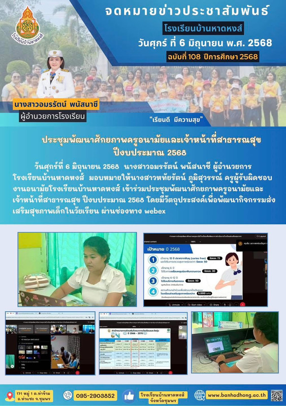 วันศุกร์ ที่ 6 มิถุนายน 2568 นางสาวอมรรัตน์ พนัสนาชี ผู้อำนวยการโรงเรียนบ้านหาดหงส์ มอบหมายให้นางสาวหทัยรัตน์ ภูมิสุวรรณ์ ครูผู้รับผิดชอบงานอนามัยโรงเรียนบ้านหาดหงส์ เข้าร่วมประชุมพัฒนาศักยภาพครูอนามัยและเจ้าหน้าที่สาธารณสุข ปีงบประมาณ 2568 โดยมีวัตถุประสงค์เพื่อพัฒนากิจกรรมส่งเสริมสุขภาพเด็กในวัยเรียน ผ่านช่องทาง webex