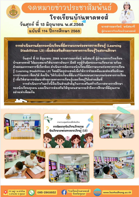 วันศุกร์ ที่ 13 มิถุนายน 2568 นางสาวอมรรัตน์ พนัสนาชี ผู้อำนวยการโรงเรียนบ้านหาดหงส์ ได้มอบหมายให้ นางสาวอัจฉรา มีสติ ครูผู้รับผิดชอบงานเรียนรวม พร้อมด้วยคณะกรรมการที่เกี่ยวข้อง ดำเนินการคัดกรองนักเรียนที่มีความบกพร่องทางการเรียนรู้ (Learning Disabilities: LD) โดยมีวัตถุประสงค์เพื่อให้การช่วยเหลือและส่งเสริมทักษะการอ่านออก เขียนได้ คิดเป็น ให้กับนักเรียนที่มีแนวโน้มจะพบความบกพร่องทางการเรียนรู้ เพื่อให้สามารถพัฒนาศักยภาพทางการเรียนรู้และเรียนรู้ได้อย่างเต็มที่