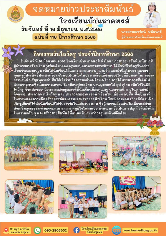 วันจันทร์ ที่ 16 มิถุนายน 2568 โรงเรียนบ้านหาดหงส์ นำโดย นางสาวอมรรัตน์ พนัสนาชี ผู้อำนวยการโรงเรียน พร้อมด้วยคณะครูและบุคลากรทางการศึกษา ได้จัดพิธีไหว้ครูขึ้นอย่างเรียบง่ายและอบอุ่น เพื่อให้นักเรียนได้แสดงความเคารพ ความรัก และสำนึกในพระคุณของคุณครูผู้ประสิทธิ์ประสาทวิชา ซึ่งนับเป็นหนึ่งในประเพณีอันดีงามของไทยที่สืบทอดกันมาอย่างยาวนานนักเรียนทุกระดับชั้นได้เข้าร่วมกิจกรรมอย่างพร้อมเพรียง ภายใต้บรรยากาศที่เต็มไปด้วยความซาบซึ้งและความเคารพ โดยมีการจัดเตรียม พานพุ่มดอกไม้ ธูป เทียน เพื่อใช้ในพิธีไหว้ครู ซึ่งแสดงออกถึงความกตัญญูกตเวทีที่นักเรียนมีต่อคุณครู นอกจากนี้ ภายในงานยังมีกิจกรรม ประกวดพานไหว้ครู และ ประกวดผลงานของนักเรียนในแต่ละระดับชั้น ซึ่งเป็นเวทีในการแสดงความคิดสร้างสรรค์และความสามารถของนักเรียน โดยมีการมอบ เกียรติบัตร เพื่อเชิดชูเกียรติให้กับนักเรียนที่ได้รับรางวัลในแต่ละประเภท ซึ่งกิจกรรมดังกล่าวไม่เพียงแต่ช่วยส่งเสริมคุณธรรมจริยธรรมและความภาคภูมิใจในตนเองเท่านั้น แต่ยังเป็นการปลูกฝังจิตสำนึกในความกตัญญู และสร้างสายสัมพันธ์ที่แน่นแฟ้นระหว่างครูและศิษย์อีกด้วย