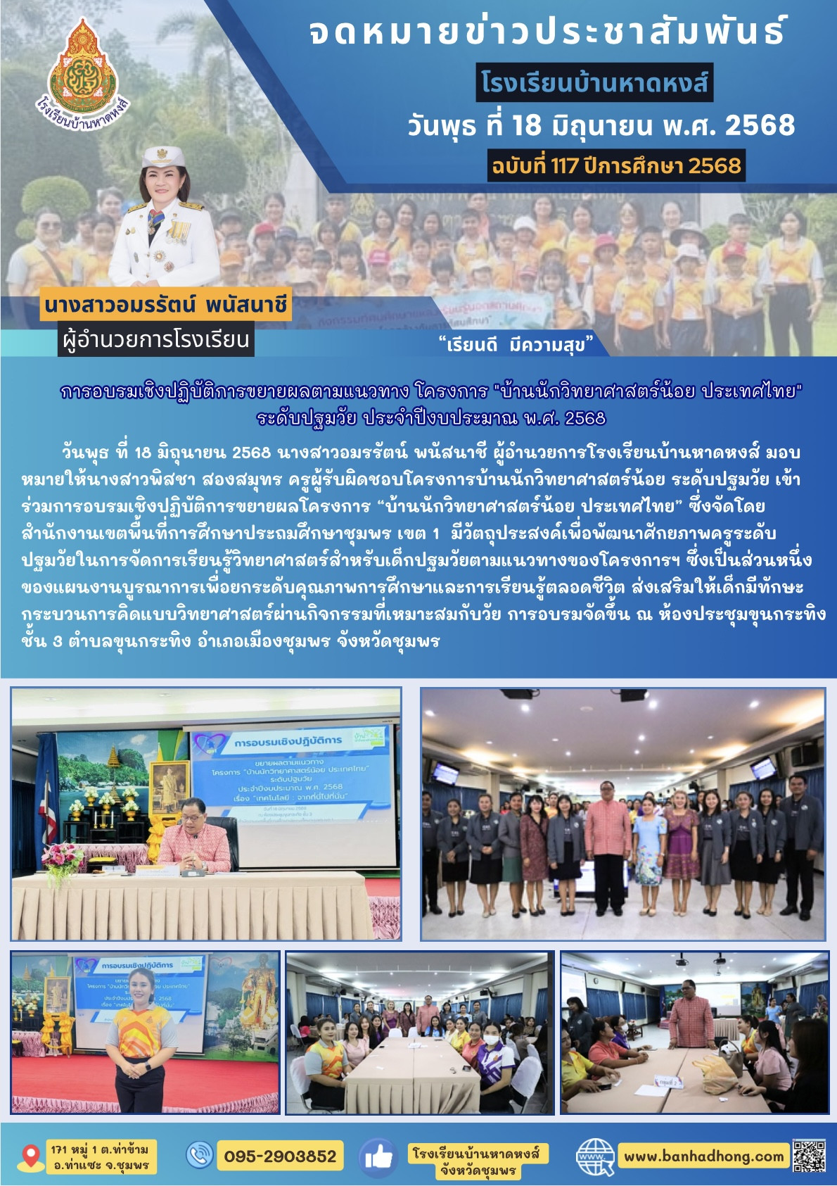 วันพุธ ที่ 18 มิถุนายน 2568 นางสาวอมรรัตน์ พนัสนาชี ผู้อำนวยการโรงเรียนบ้านหาดหงส์ มอบหมายให้นางสาวพิสชา สองสมุทร ครูผู้รับผิดชอบโครงการบ้านนักวิทยาศาสตร์น้อย ระดับปฐมวัย เข้าร่วมการอบรมเชิงปฏิบัติการขยายผลโครงการ “บ้านนักวิทยาศาสตร์น้อย ประเทศไทย” ซึ่งจัดโดยสำนักงานเขตพื้นที่การศึกษาประถมศึกษาชุมพร เขต 1 มีวัตถุประสงค์เพื่อพัฒนาศักยภาพครูระดับปฐมวัยในการจัดการเรียนรู้วิทยาศาสตร์สำหรับเด็กปฐมวัยตามแนวทางของโครงการฯ ซึ่งเป็นส่วนหนึ่งของแผนงานบูรณาการเพื่อยกระดับคุณภาพการศึกษาและการเรียนรู้ตลอดชีวิต ส่งเสริมให้เด็กมีทักษะกระบวนการคิดแบบวิทยาศาสตร์ผ่านกิจกรรมที่เหมาะสมกับวัย การอบรมจัดขึ้น ณ ห้องประชุมขุนกระทิง ชั้น 3 ตำบลขุนกระทิง อำเภอเมืองชุมพร จังหวัดชุมพร