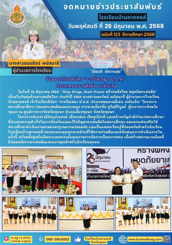 วันที่ 26 มิถุนายน 2568 “Stop Drugs, Start Power สร้างพลังไทย หยุดภัยยาเสพติด” เนื่องในวันต่อต้านยาเสพติดโลก ประจำปี 2568 นางสาวอมรรัตน์ พนัสนาชี ผู้อำนวยการโรงเรียนบ้านหาดหงส์ เข้ารับเกียรติบัตร “รางวัลเสมา ป.ป.ส. ประเภทผลงานดีเด่น ระดับเงิน” โครงการ