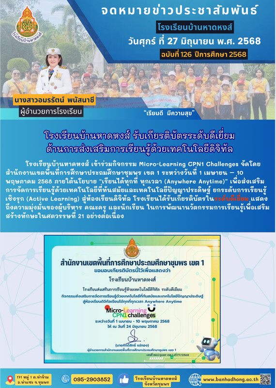 โรงเรียนบ้านหาดหงส์ เข้าร่วมกิจกรรม Micro-Learning CPN1 Challenges จัดโดยสำนักงานเขตพื้นที่การศึกษาประถมศึกษาชุมพร เขต 1 ระหว่างวันที่ 1 เมษายน – 10 พฤษภาคม 2568 ภายใต้นโยบาย “เรียนได้ทุกที่ ทุกเวลา (Anywhere Anytime)” เพื่อส่งเสริมการจัดการเรียนรู้ด้วยเทคโนโลยีที่ทันสมัยและเทคโนโลยีปัญญาประดิษฐ์ ยกระดับการเรียนรู้เชิงรุก (Active Learning) สู่ห้องเรียนดิจิทัล โรงเรียนได้รับเกียรติบัตรในระดับดีเยี่ยม แสดงถึงความมุ่งมั่นของผู้บริหาร คณะครู และนักเรียน ในการพัฒนานวัตกรรมการเรียนรู้เพื่อเสริมสร้างทักษะในศตวรรษที่ 21 อย่างต่อเนื่อง |