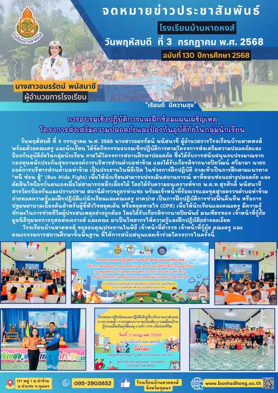 วันพฤหัสบดี ที่ 3 กรกฎาคม พ.ศ. 2568 นางสาวอมรรัตน์ พนัสนาชี ผู้อำนวยการโรงเรียนบ้านหาดหงส์ พร้อมด้วยคณะครู และนักเรียน ได้จัดกิจกรรมอบรมเชิงปฏิบัติการตามโครงการส่งเสริมความปลอดภัยและป้องกันอุบัติภัยในกลุ่มนักเรียน ภายใต้โครงการสถานศึกษาปลอดภัย ซึ่งได้รับการสนับสนุนงบประมาณจากกองทุนหลักประกันสุขภาพองค์การบริหารส่วนตำบลท่าข้าม และได้รับเกียรติจากนายปิยวัฒน์ ศรีมาลา นายกองค์การบริหารส่วนตำบลท่าข้าม เป็นประธานในพิธีเปิด ในช่วงการฝึกปฏิบัติ ภาคเช้าเป็นการฝึกตามแนวทาง “หนี ซ่อน สู้” (Run Hide Fight) เพื่อให้นักเรียนสามารถประเมินสถานการณ์ หาที่หลบซ่อนอย่างปลอดภัย และตัดสินใจป้องกันตนเองเมื่อไม่สามารถหลีกเลี่ยงได้ โดยได้รับความอนุเคราะห์จาก พ.ต.ท.สุรศักดิ์ พนัสนาชี สารวัตรป้องกันและปราบปราม สถานีตำรวจภูธรท่าแซะ พร้อมเจ้าหน้าที่ร้อยเวรและชุดสายตรวจตำบลท่าข้าม ถ่ายทอดความรู้และฝึกปฏิบัติแก่นักเรียนและคณะครู ภาคบ่าย เป็นการฝึกปฏิบัติการช่วยฟื้นคืนชีพ หรือการปฐมพยาบาลเบื้องต้นสำหรับผู้ที่หัวใจหยุดเต้น หรือหยุดหายใจ (CPR) เพื่อให้นักเรียนและคณะครู มีความรู้ ทักษะในการช่วยชีวิตผู้ประสบเหตุอย่างถูกต้อง โดยได้รับเกียรติจากนายปิยพันธ์ มนเฑียรทอง เจ้าหน้าที่กู้ภัยมูลนิธิชุมพรการกุศลสงเคราะห์ และคณะ มาเป็นวิทยากรให้ความรู้และฝึกปฏิบัติอย่างละเอียด